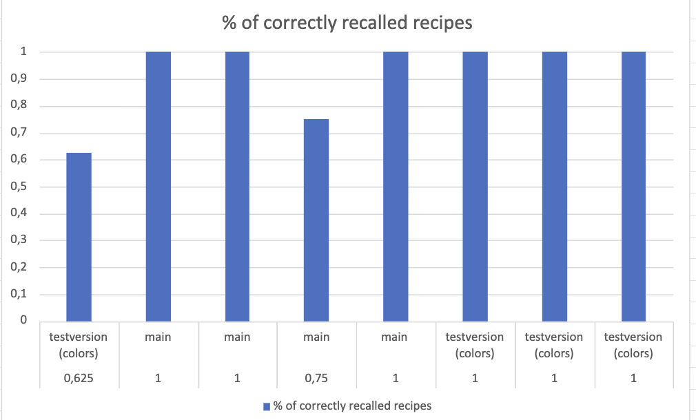 Users were able to correctly find and identify on average 84.3% of recipes and they recalled 92.1% correctly after a short break. Important to note for task 3 is, that this task also showed fairly clearly, that the color of the recipe cards was not determinative to how well users could distinguish and recall recipes.