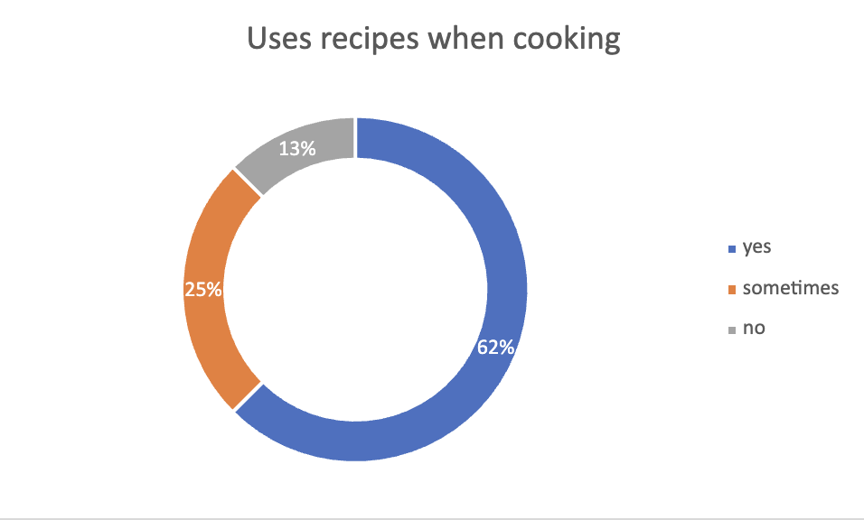 63% use recipes most of the time or everytime when cooking, 25% use them only a few times, and 13% don't use them at all.